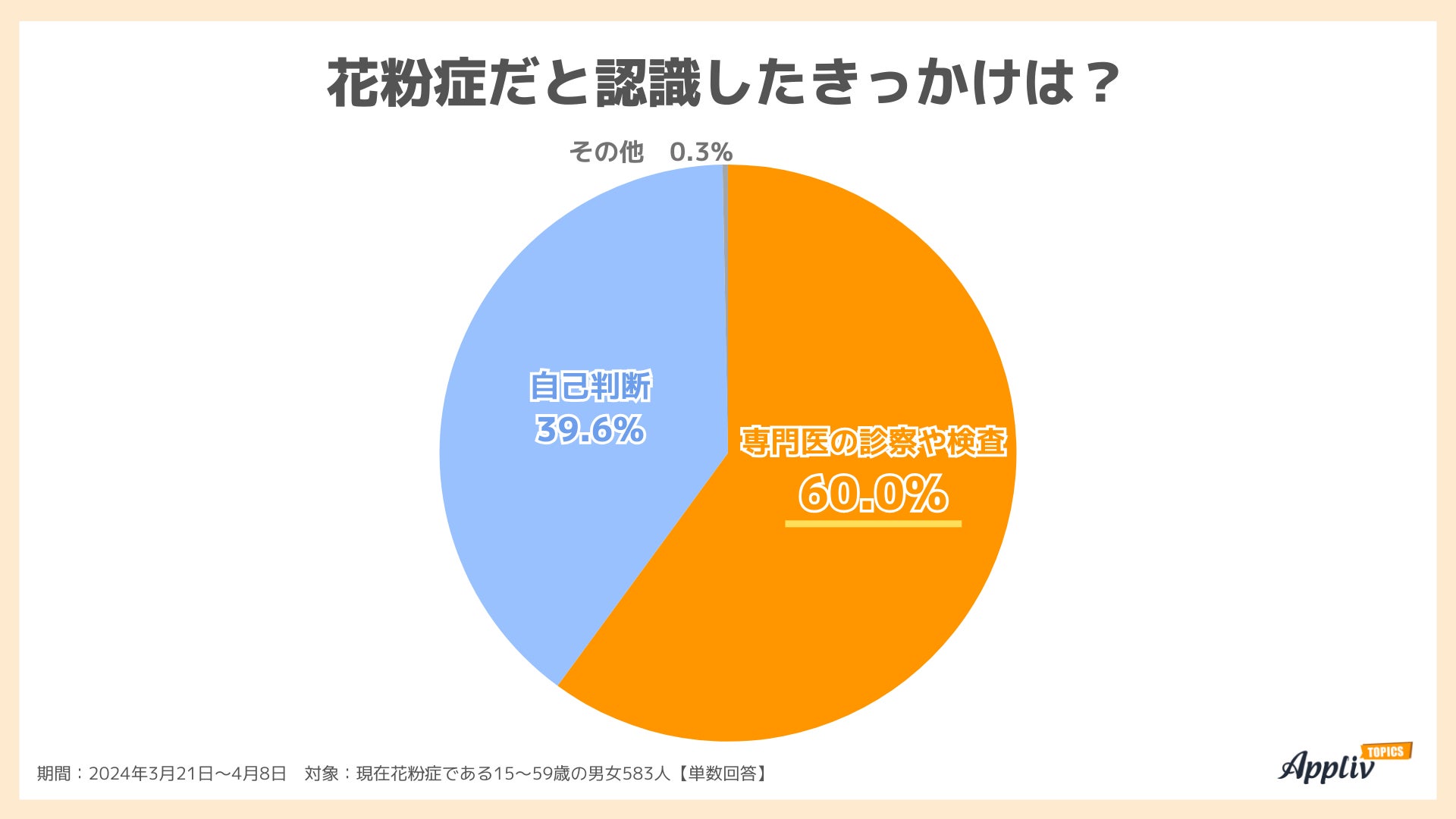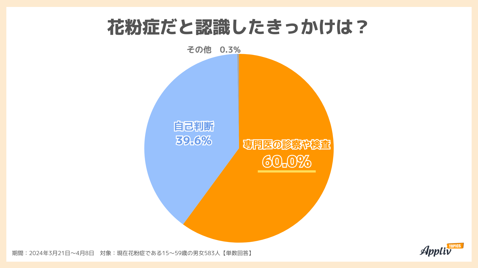 花粉症だと認識したきっかけは「専門医の診察や検査」が60%、「自己判断」が39.6%