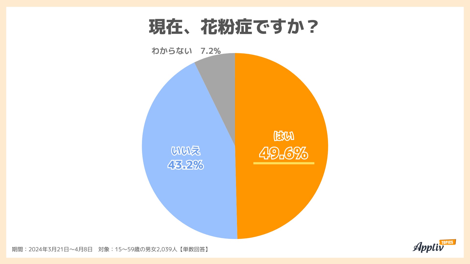 事前調査で、10代~50代の男女2,039人を対象に現在花粉症かどうかを調査したところ、「はい(49.6%)」、「いいえ(43.2%)」という結果でした。