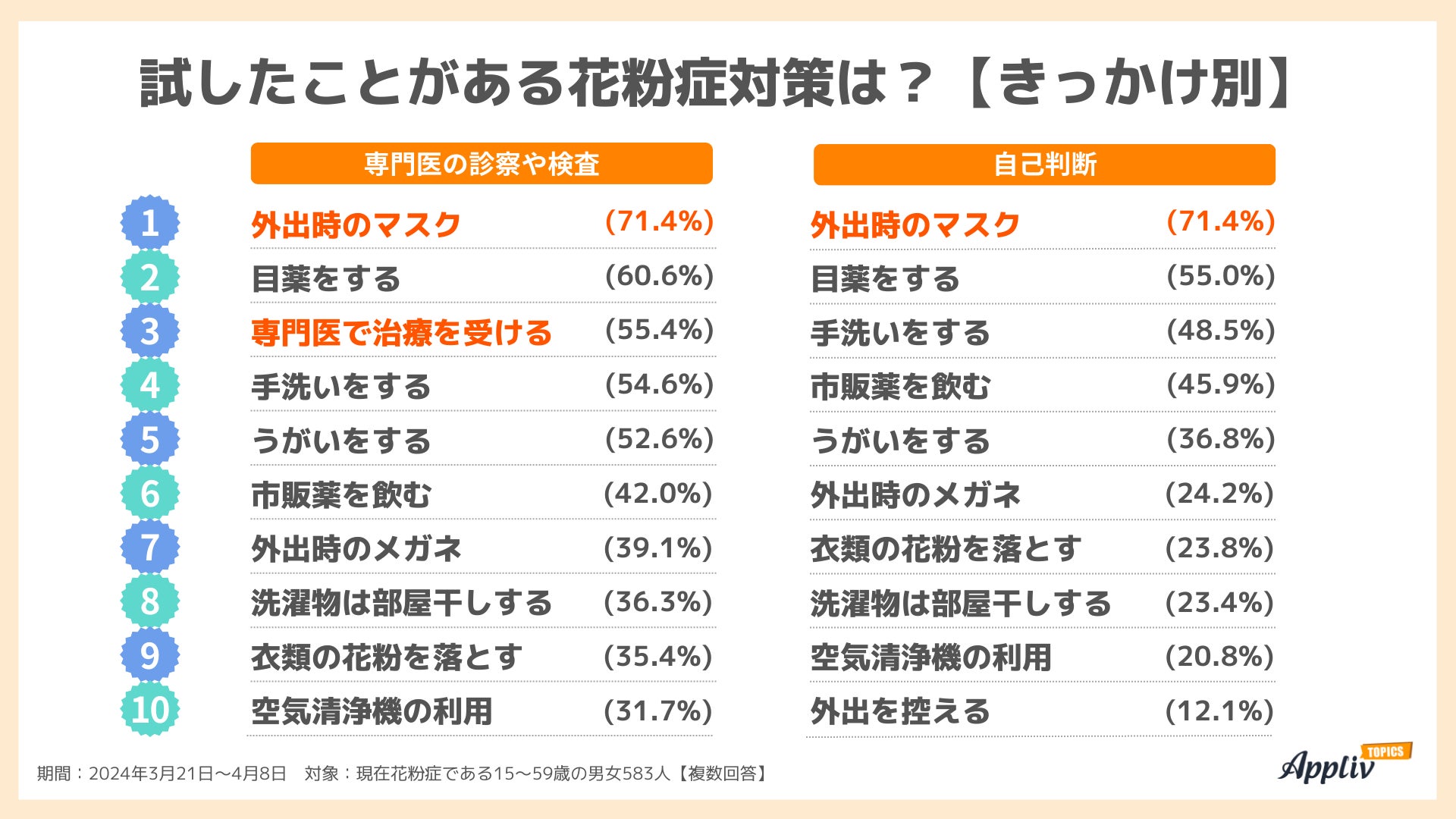 花粉症だと認識したきっかけ別で比較すると、専門医の診察を受診した人、自己判断した人の1位は「外出時のマスク」でした。マスクをすることは、症状を和らげるために一般的な対策だと言えるでしょう。