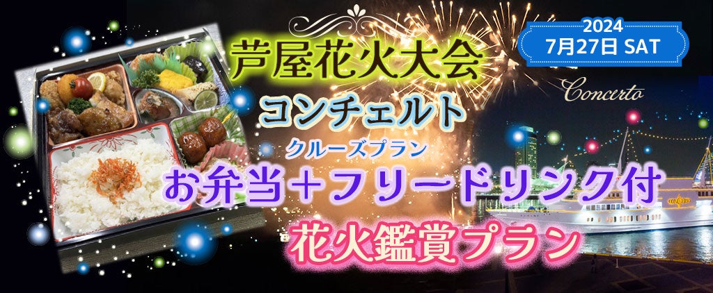 【新プラン20席限定】お一人様¥11,000- 7月27日《芦屋花火大会を船上で見よう》(18:15出港) コンチェルト 【お弁当+フリードリンク付 プラン】のオンライン予約を開始しました。