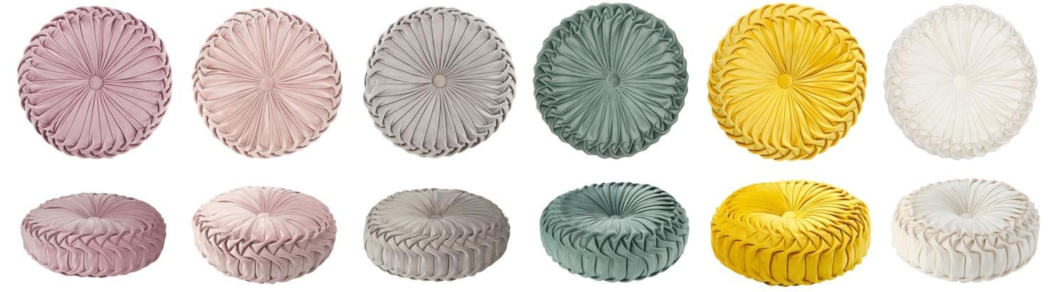 ダリアの花をモチーフにした円形クッションは、置くだけでお部屋に"かわいい"をプラスできるとお客様より大好評いただいているアイテムです。サイズは直径40cm、厚みは15cmと十分な存在感でお部屋を彩ります。