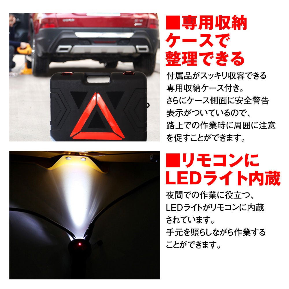 付属品がスッキリ収容できる専用収納ケース付き。いざというときのために車のトランクに標準装備できます。 さらにケース側面に安全警告表示がついているので、路上での作業時に周囲に注意を促すことができます。