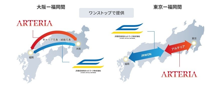 アルテリアルートと山陽新幹線の沿線を通るJRWONルートを組み合わせ、大阪~福岡間においてキャリア冗長・経路冗長の専用線サービスをワンストップで提供します。また、東京~大阪間のアルテリアルートと大阪~福岡間のJRWONルートを組み合わせ、東京~福岡間をワンストップで提供します。