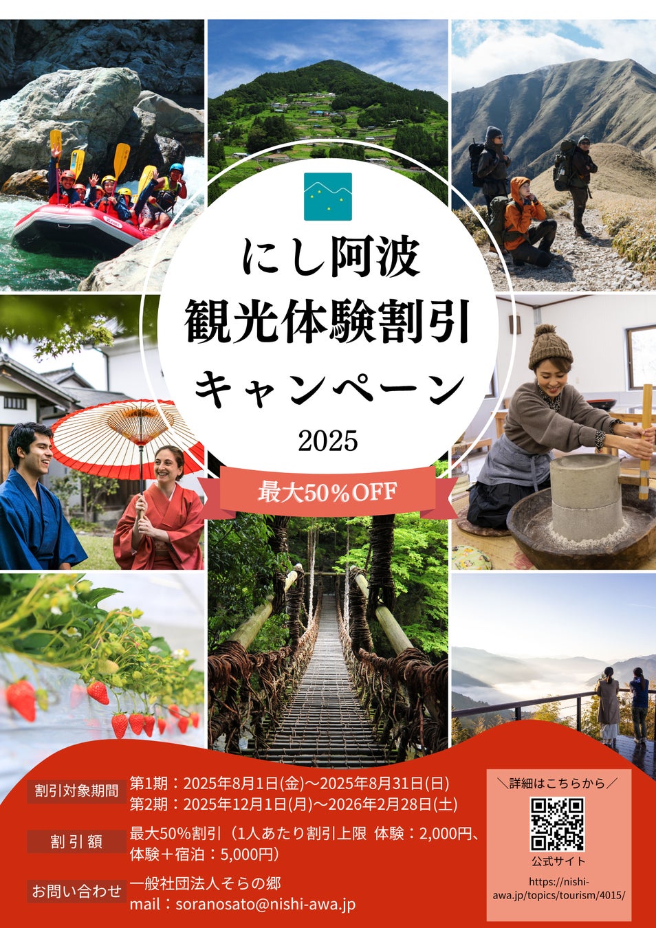 「にし阿波地域」への誘客及び観光消費額の拡大を図るため、利用料金を通常価格から最大50%割引する、「にし阿波ならではの体験割引キャンペーン」を実施します。