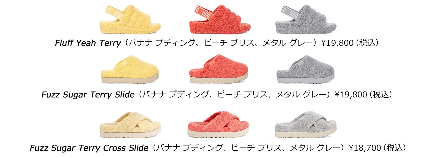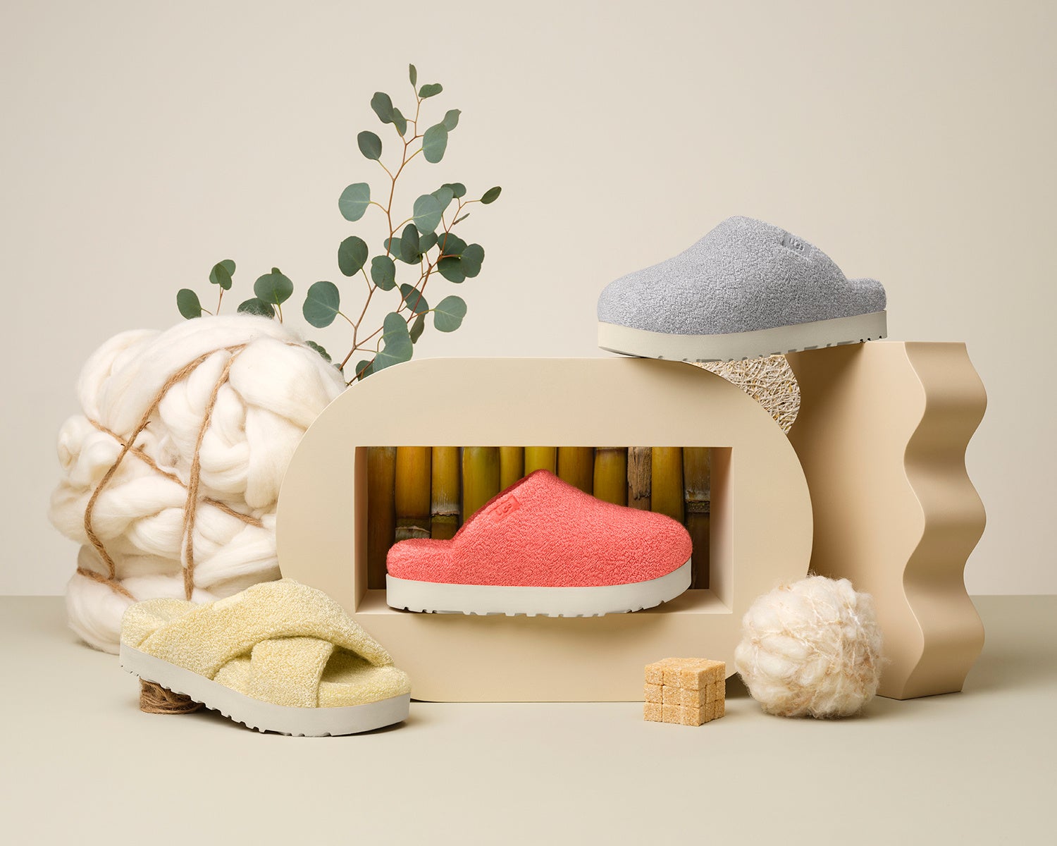 環境に配慮して慎重にデザインされたIcon-Impactコレクションには、UGGならではのアイコニックなルック・アンド・フィールを受け継ぐ3つのスタイルがフィーチャーされています。Fluff Yeah Terry(フラッフ イヤー テリー)、Fuzz Sugar Terry Slide(ファズ シュガー テリー スライド)、Fuzz Sugar Terry Cross Slide(ファズ シュガー テリー クロス スライド)は、環境への影響が少ない素材で作られており、これらの素材から排出される少量の二酸化炭素をオフセットすることで、カーボンニュートラルを実現。UGGならではのルック・アンド・フィールはそのままに、ウールは、RWS(Responsible Wool Standard)の認証を受けたものだけを使用し、持続可能な方法で調達された天然木を原材料とするTENCEL™リヨセルとブレンドした特徴的なタオル地素材が、UGGの人気スタイルにひねりを加え、軽量で暑い夏にも履きやすい、さらっとした肌触りの良いサンダルに仕上げています。再生可能な資源であるサトウキビから作られたアウトソールSugarSole™を採用し、バックストラップはTENCEL™ リヨセルを90%使用、UGGロゴ織りラベルはTENCEL™ リヨセル100%使用など、細かい部分まで環境に配慮した本コレクションは、UGGの心地良さがすべて詰まった、履く人の心まで「FEEL GOOD」にしてくれるアイテムです。