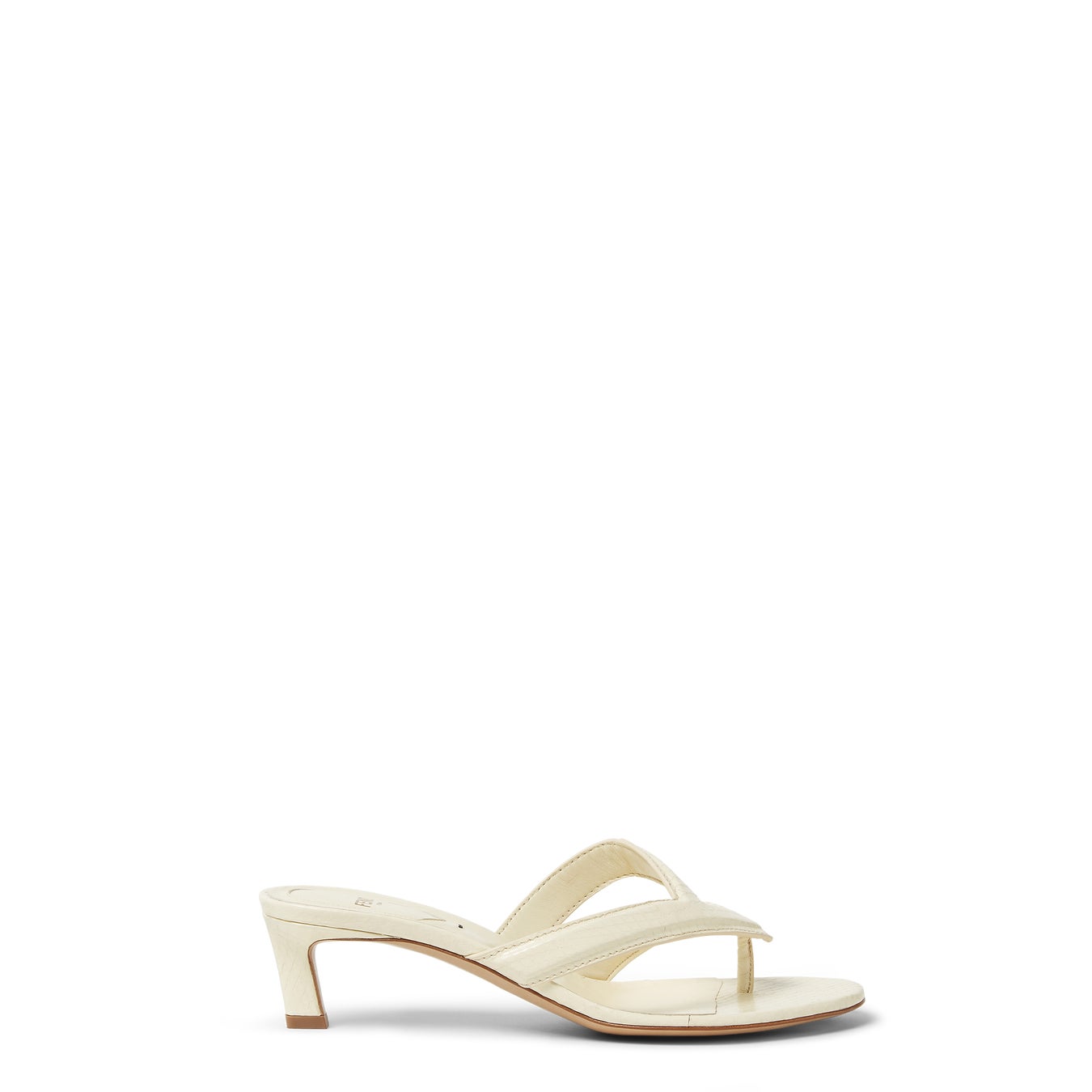 暑い季節にぴったりの涼しげな「フェンディ フリング」サンダルは、夏の恋心を反映してその名が付けられました。 抽象的なシングル「F」モチーフが甲を包み込む大胆なデザインは、カール・ラガーフェルド(Karl Lagerfeld)によるアーカイブのスケッチからインスピレーションを受けています。またその「F」モチーフは左右で反転してあしらわれており、メゾンの遊び心が表れています。ホワイトとブラウンの最高級エアーズレザーを使用したオープントゥスタイルはどのようなルックの足先もエレガントに仕上げ、同じレザーでカバーされた4.6cmのミドルヒールが、後ろ姿にも完璧な美しさを添えます。