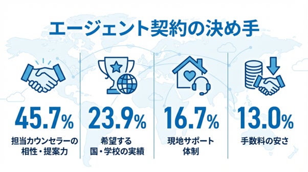本調査では、留学エージェントの情報収集方法から、契約の決め手、有料サポートの利用理由、さらには担当者とのコミュニケーションに至るまで、利用者のリアルな実態を明らかにすることを目的としています。調査の結果、留学エージェントを最終的に決定する最大の要因は「カウンセラーとの相性」であることが判明しました。