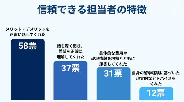 「信頼できる担当者だと感じた言動」について尋ねたところ、「メリットだけでなく、デメリットやリスクも正直に説明してくれた(42.0%)」が最も多く、次いで「こちらの希望や状況を親身になって聞いてくれた(26.8%)」が続きました。利用者は、単に良い情報だけでなく、留学の現実を誠実に伝えてくれる姿勢を高く評価していることがわかります。