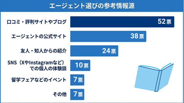 その他にも多様なエージェントの名前が挙がり、結果は拮抗しました。留学エージェントは多様化しており、各自の希望によって自由に選択可能であることがうかがえます。