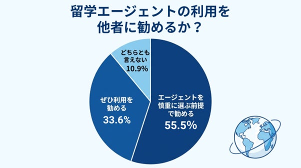 エージェントの利用を他の人に勧めるかという質問に対し、「エージェント選びを慎重にする前提で勧める(55.5%)」、「ぜひ利用を勧める(33.6%)」と約9割が留学エージェントを「推奨する」と回答しており、多くの利用者がエージェントの価値を実感していることが示されました。