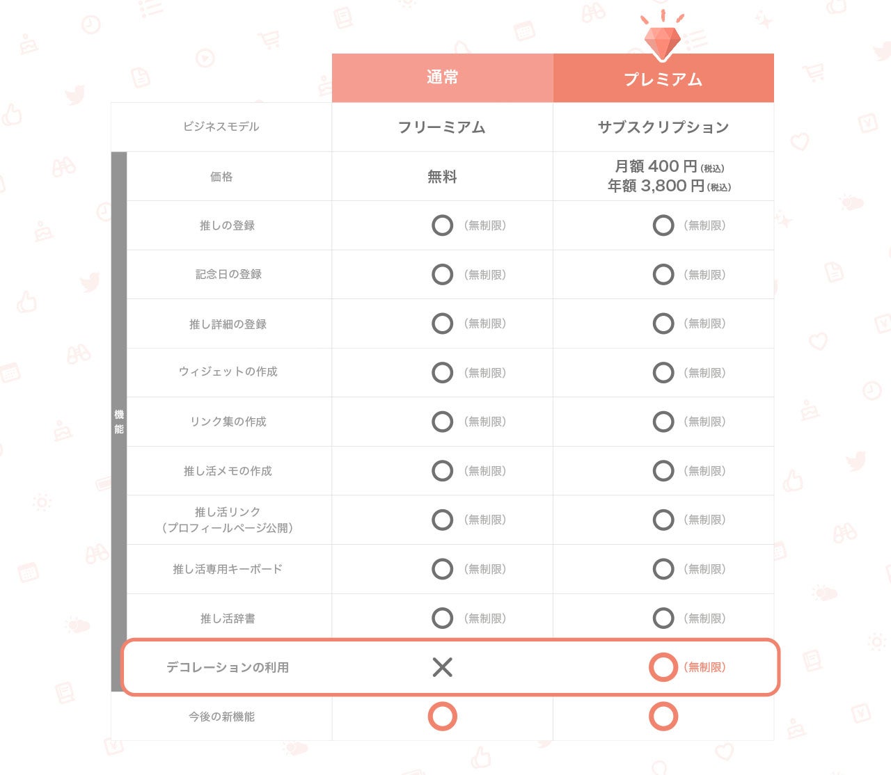 『プレミアム』は、アプリ内に追加されたサブスクリプションの利用プランです。今回は、このプラン内の「デコレーションの利用」について機能を拡大しました。