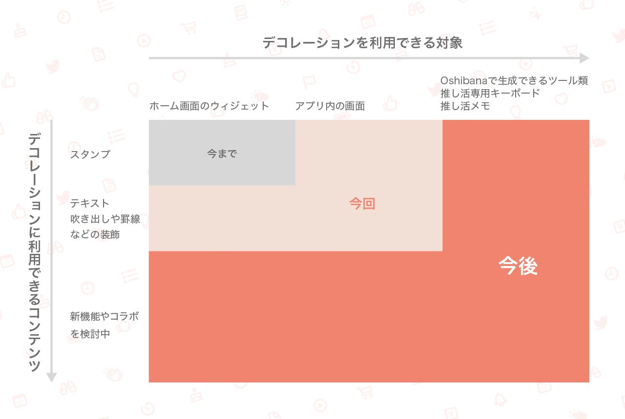 今後は、デコレーションを利用できる対象とコンテンツの2軸で拡充を予定しており、ユーザーの推し活で満たされる時間を最大化します。利用できる対象については、ホーム画面のウィジェットに続いて、アプリ内の画面や推し活メモといった各機能、他社アプリやサービスでも利用することができる推し活専用キーボードについてもデコレーションを楽しめるようにする予定です。