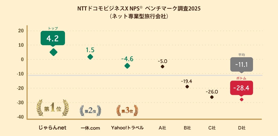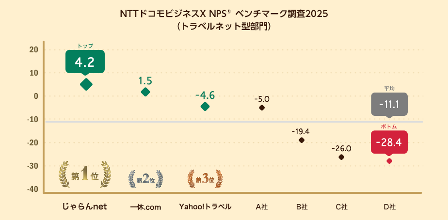 NTTドコモビジネスX株式会社(旧:NTTコムオンライン、本社:東京都品川区、代表取締役社長:稲葉 秀司、以下NTTドコモビジネスX)は、ネット専業型旅行会社を対象にNPSベンチマーク調査2025を実施しました。この結果、最もNPSが高いのはじゃらんnetとなりました。