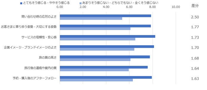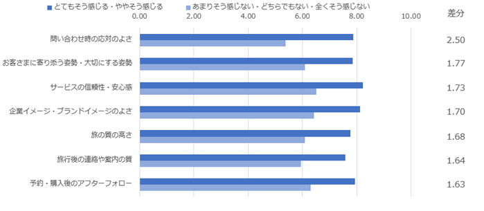 また、旅行時の安心感別に満足度も比較したところ、いずれの項目も「とてもそう感じる」または「ややそう感じる」と回答した人の評価がそれ以外の回答者と比較して高くなりました。最も満足度の差分が大きくなったのは「問い合わせ時の応対のよさ」となり、次いで「お客さまに寄り添う姿勢・大切にする姿勢」、「サービスの信頼性・安心感」、「企業イメージ・ブランドイメージのよさ」、「旅の質の高さ」といった項目で差が大きくなりました。旅行時の安心感を醸成していくことで企業イメージやサービスの信頼感の向上などにつなげられることがうかがえる結果となりました。