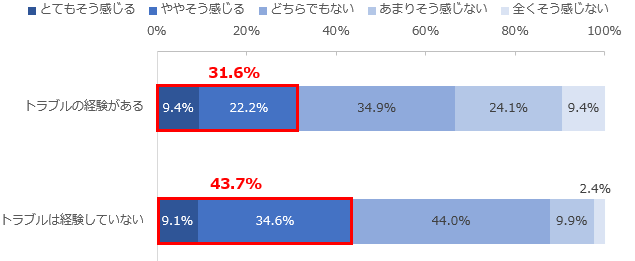 トラブルの経験別に旅行時の安心感についても分析したところ、「とてもそう感じる」または「ややそう感じる」と回答した割合はトラブルの経験がある人においては31.6%とトラブルの経験がない人に比べて割合が少なくなり、旅行時に安心感を感じていない傾向がみられました。