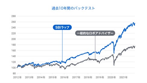 ※バックテストの期間は2012/1/4から2021/12/30とし、運用にかかる費用については、SBIラップは手数料および信託報酬として運用資産額の0.746%(年率・税抜)を、一般的なロボアドバイザーでは手数料として運用資産額の1%(年率・税抜)を徴収し、分配金は投資の拠出金銭に自動的に組み入れたものとして計算しています。なお、本テストにおける実績は、当該期間における実質的な投資対象となるETFの時価評価額を用いて計算を行っているため、当該ETFの経費率も考慮されています。分配金やリバランス時の譲渡益にかかる税金は考慮していません。
