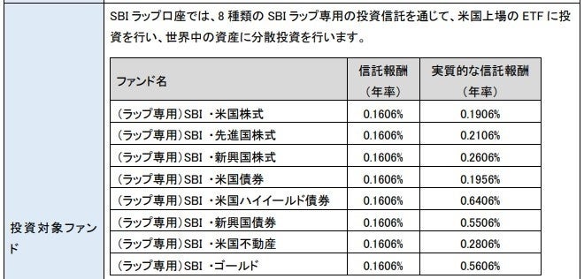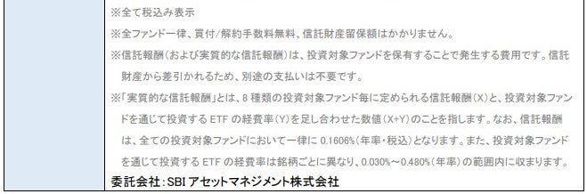※「実質的な信託報酬」とは、8種類の投資対象ファンド毎に定められる信託報酬(X)と、投資対象ファンドを通じて投資するETFの経費率(Y)を足し合わせた数値(X+Y)のことを指します。なお、信託報酬は、全ての投資対象ファンドにおいて一律に0.1606%(年率・税込)となります。また、投資対象ファンドを通じて投資するETFの経費率は銘柄毎に異なり、0.030%~0.480%(年率)の範囲に収まります。「実質的な信託報酬の合計額」については、8種類の投資対象ファンドの組み入れ状況によって異なりますが、最新の運用戦略を用いて運用を行った場合、その合計額は0.220%~0.394%(年率・税込)の範囲内に収まります。「実質的な信託報酬の合計額」の平均値については、2012/1/4~2021/12/30までSBIラップで運用を行ったと仮定したバックテストによって示された平均投資配分比率を基に算出したもので、その値は0.295%(年率・税込、小数点第4位切上げ)となりますが、実際の運用においては、この数値を上回る場合があります。