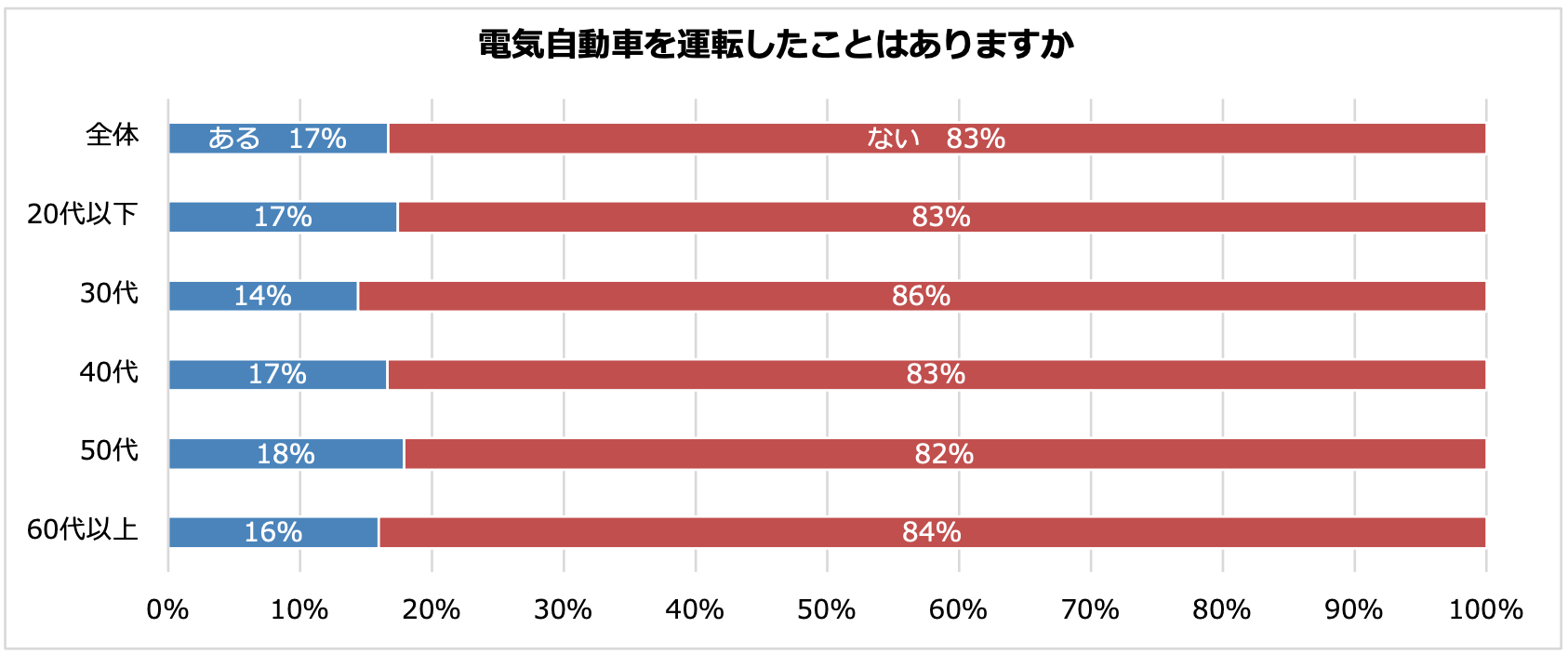 電気自動車を運転したことが「ある」人は17%という結果になり、年代別でも傾向に大きな違いはありませんでした。