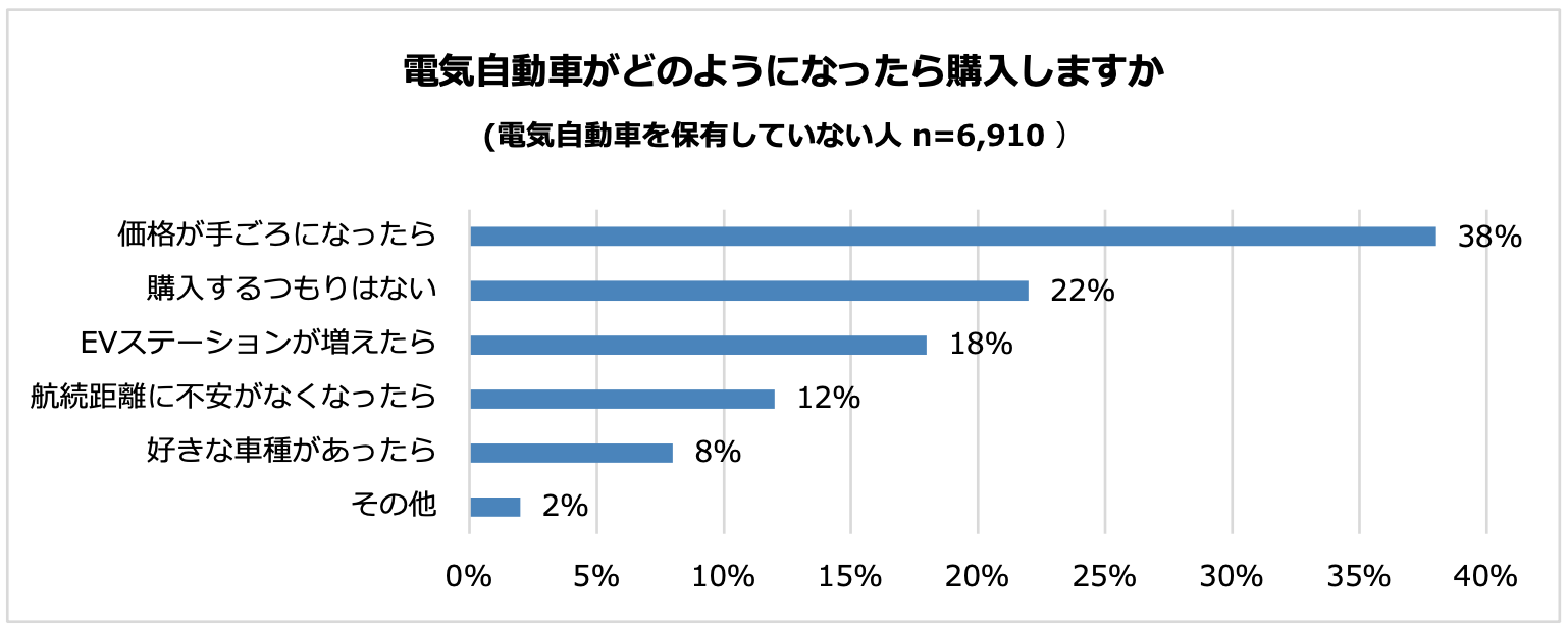 電気自動車を保有していない人に、電気自動車がどのようになったら購入するかを聞いたところ、「価格が手ごろになったら」38%が最多、「購入するつもりはない」が22%という結果になりました。3位「EVステーションが増えたら」、4位「航続距離に不安がなくなったら」、5位「好きな車種があったら」と続いています。