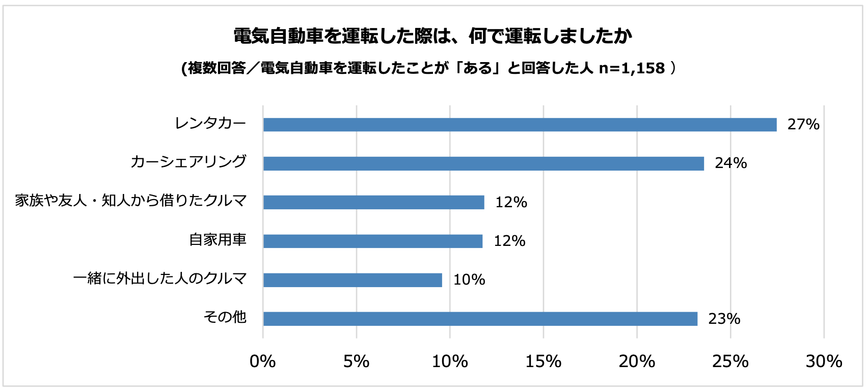 電気自動車を運転したことがある人に、何で運転したかを聞いたところ、1位は「レンタカー」27%、2位は1位と僅差で「カーシェアリング」24%となっています。以降、「家族や友人・知人から借りたクルマ」「自家用車」12%、「一緒に外出した人のクルマ」10%と続いています。「その他」では、「社有車」や「カーディーラーやイベントでの試乗」という回答が見られました。