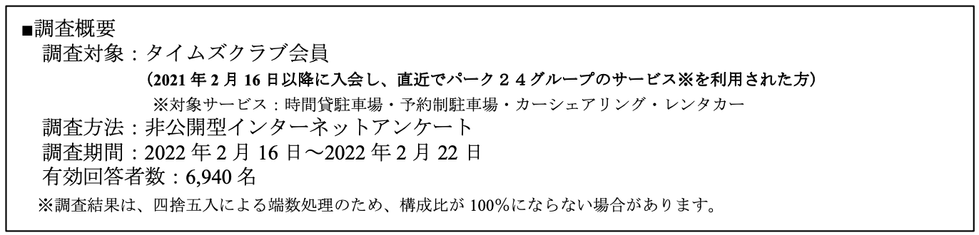 ※入会金・年会費無料の会員制ポイントプログラム。タイムズパーキングやタイムズカー、タイムズカーレンタルの利用等でポイントがたまる他、会員限定サービス等を提供。会員数約930万人(2022年3月末現在)。なお、本アンケートは、駐車場やカーシェアリング、レンタカー等のクルマに関わるサービスを利用した方々を対象としたものです。