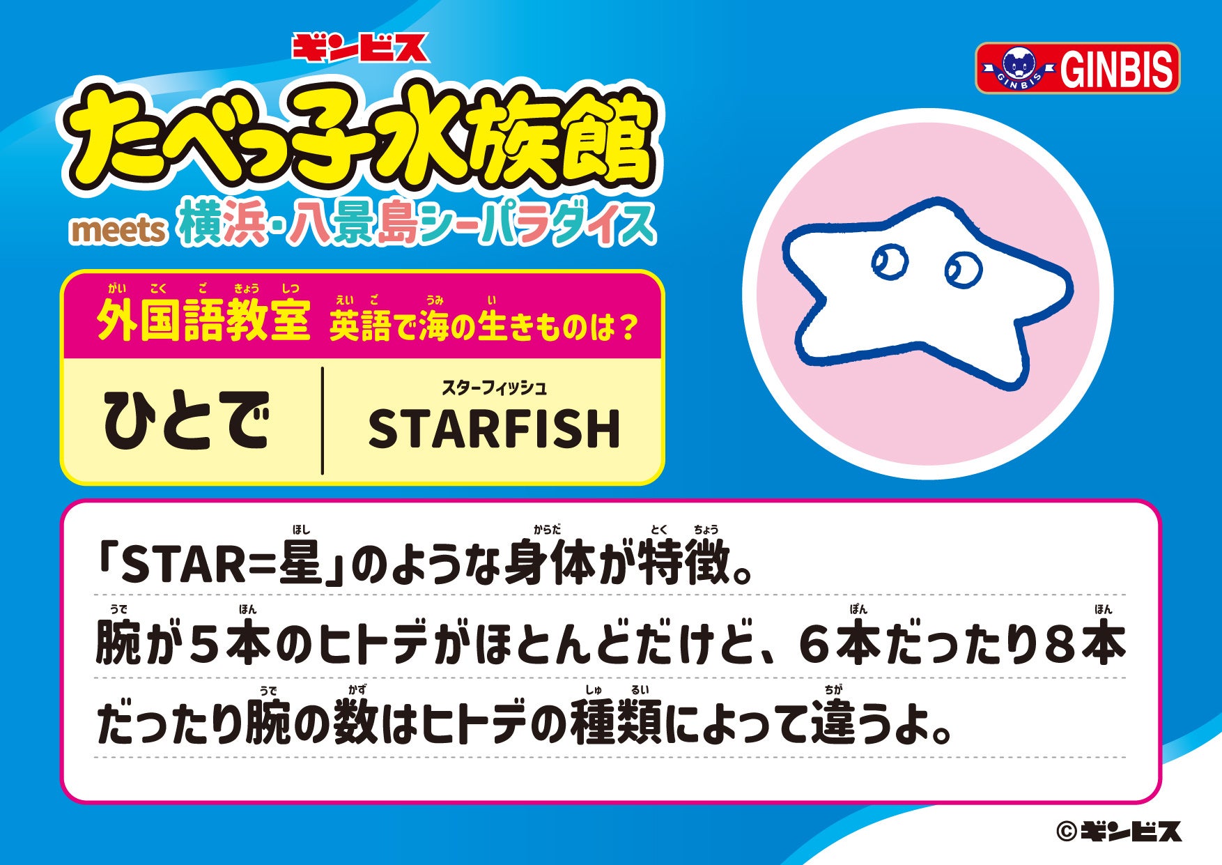 本イベントでは、「たべっ子水族館」に登場する生きものたちにフィーチャーし、シーパラの飼育員がその生きものの魅力と英語を学べる解説パネルを制作し、生きものの展示とともにお楽しみいただけるスポットを4つの水族館「アクアミュージアム」、「ドルフィン ファンタジー」、「うみファーム」、「ふれあいラグーン」内に40か所以上設置しています。