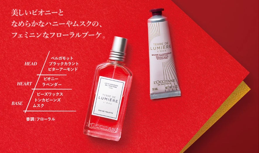 新春キットに登場する香りは、世界で一番美しい場所プロヴァンスの朝がめざめる、最も美しい瞬間を表現したフレグランス「テール ド ルミエール」。日の出とともに差し込む太陽の光は、体を包み込むように昇り始め、木々に実る果実や、花たちは蕾をほころばせます。自然が豊かにあふれるプロヴァンスのすべてを込めた香りは、つけた瞬間、これから始まる ワクワク した一日を予感させてくれます。アイテムは、オードトワレと香りをレイヤードできるハンドクリームがセットになった「テール ド ルミエール フレグランスキット」が限定登場。持ち運びにも便利な巾着バッグ付きで、新しい香りでスタートしたい自分へのギフトにも、「新春ギフト」にもおすすめです。