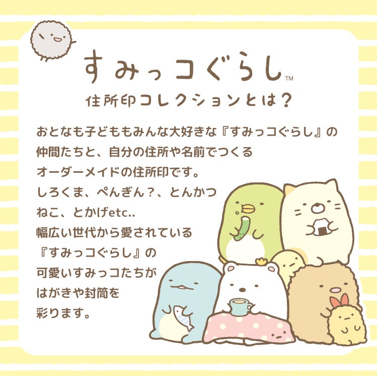 しろくま、ぺんぎん?、とんかつ、ねこ、とかげetc。幅広い世代に愛されているすみっコたちが、はがきや封筒を彩ってくれるオーダーメイドの住所印「すみっコぐらし 住所印コレクション」。