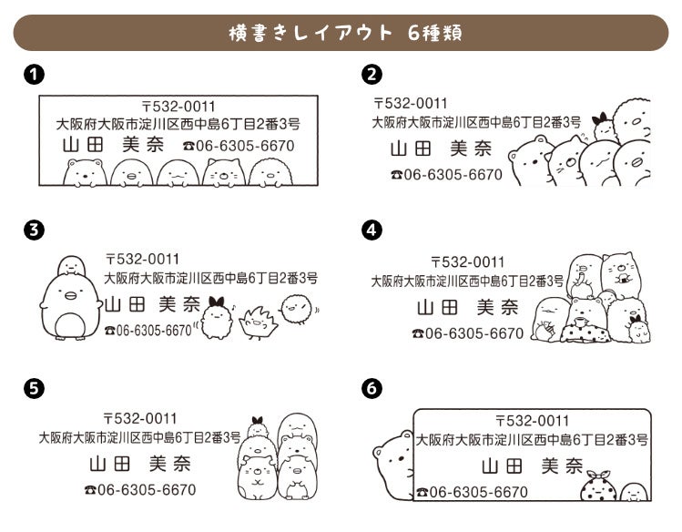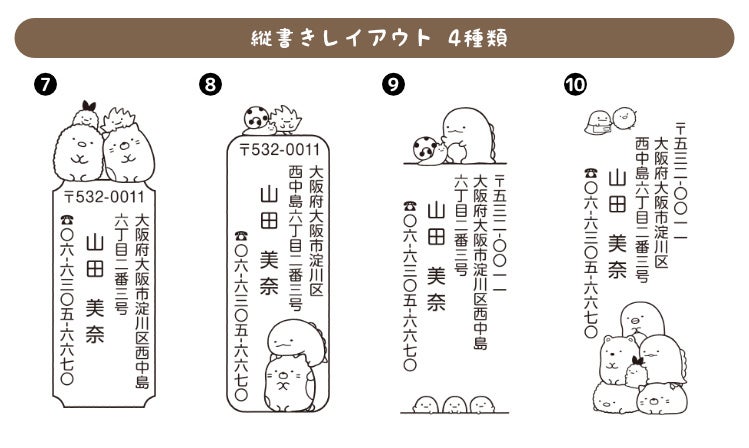 住所印のデザインは、横書きレイアウト6種類と縦書きレイアウト4種類の合計10種類。しろくま、ぺんぎん?、とんかつ、ねこ、とかげ、えびふらいのしっぽ、たぴおか、ほこり、ざっそうなどおなじみのすみっコたちが、押すたびにほっこりと癒してくれます。