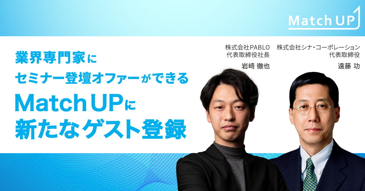 業界専門家にセミナー登壇オファーができる「Match UP」株式会社シナ・コーポレーション 遠藤 功氏、株式会社PABLO 岩崎 徹也氏が新たにゲスト登録