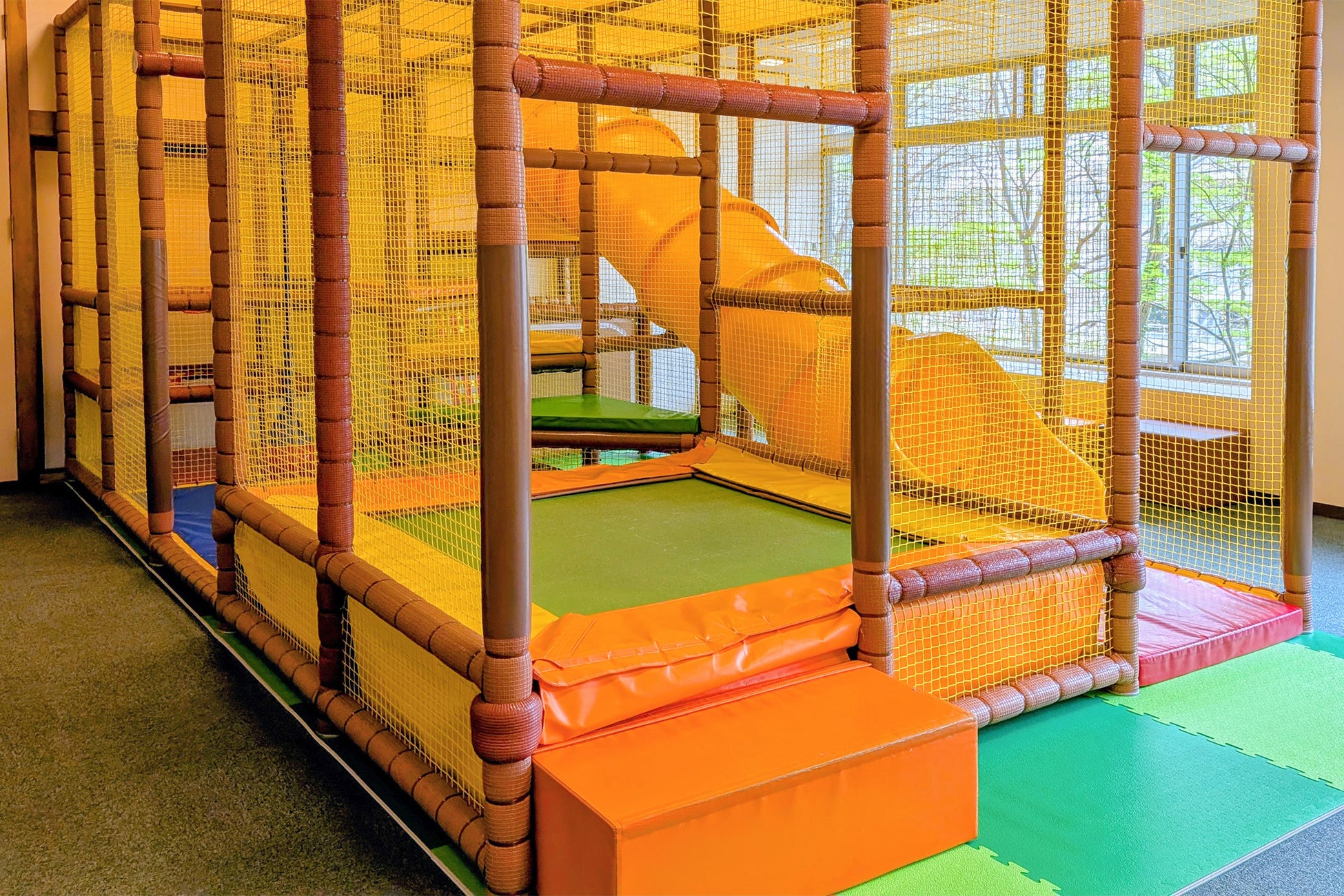 すべり台や平均台、飛び石など、山型のウレタン製遊具を設置したエリア。ウレタン製の遊具は、クッション性が高く、素材が柔らかいため、小さなのお子様も安心して遊べます。