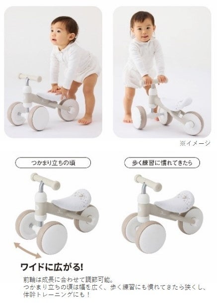 前輪の幅が調節できることで安定感が増し、成長に合わせた遊び方ができます。お子さまにやさしい機能が充実しているので多くの“できた”が体験でき、自信やチャレンジ精神を育みます。