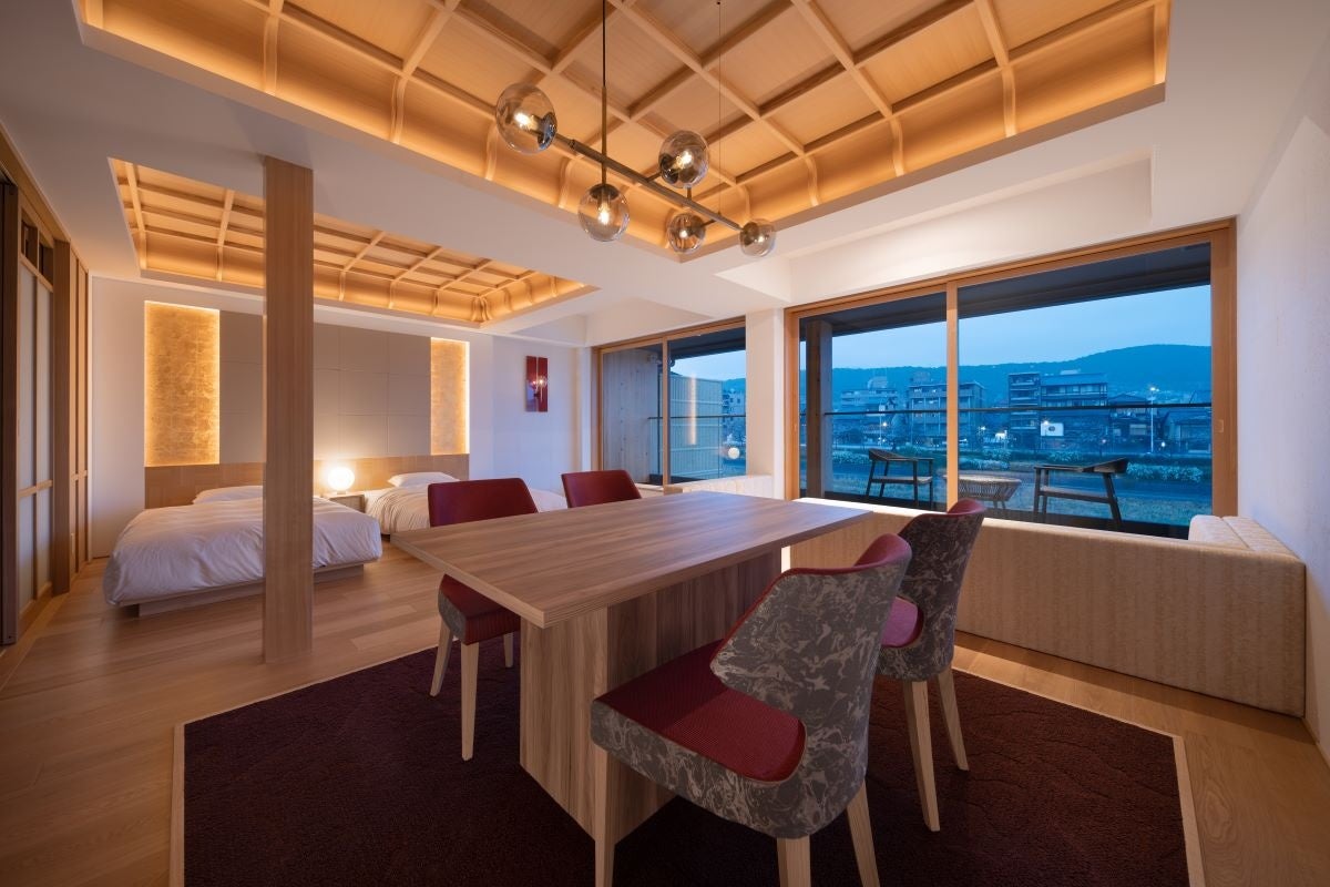 特長2、木屋町通・高瀬川に面する、元料理旅館を改修した歴史的建造物。快適でありながらも、歴史を感じる場所で過ごす京都ならではの時空体験。お食事後は宿泊者専用クラブラウンジへ。