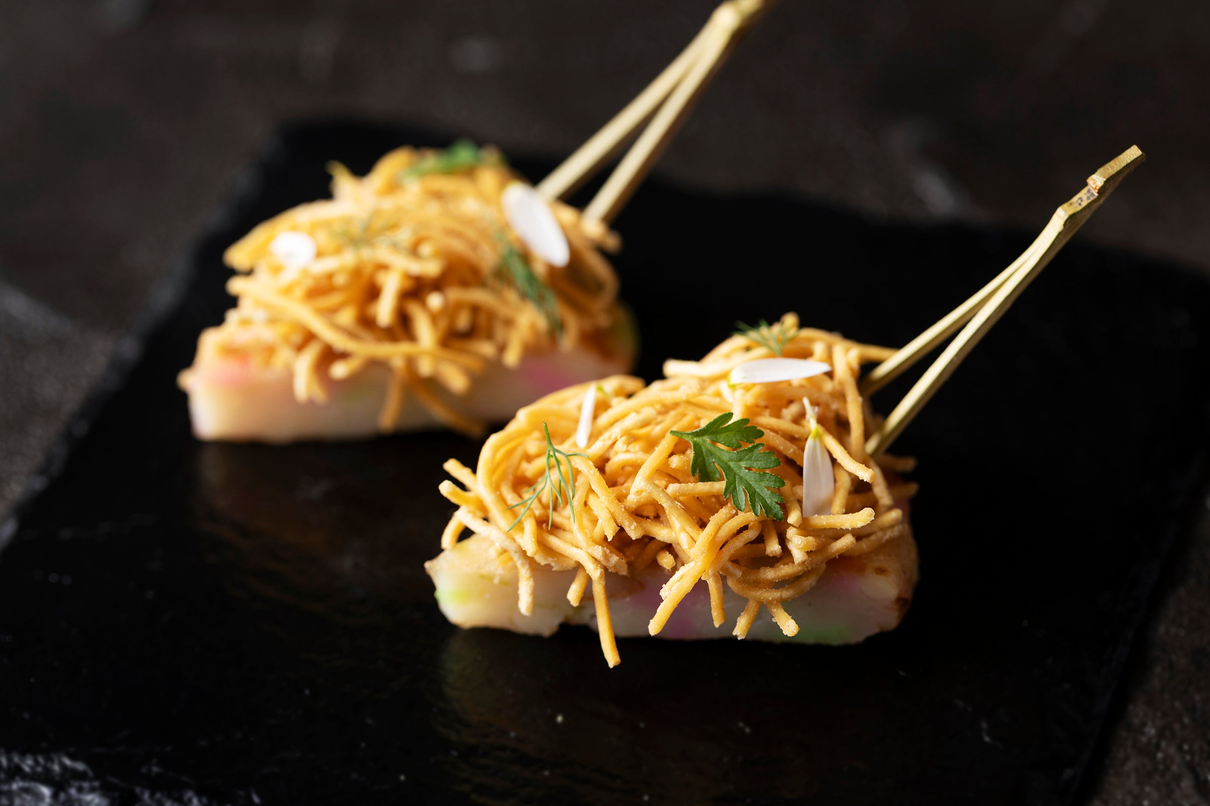 ・〈福岡県〉鯖とからし高菜のカナッペ ・〈佐賀県〉いか鉄ちゃんのチュイル仕立て