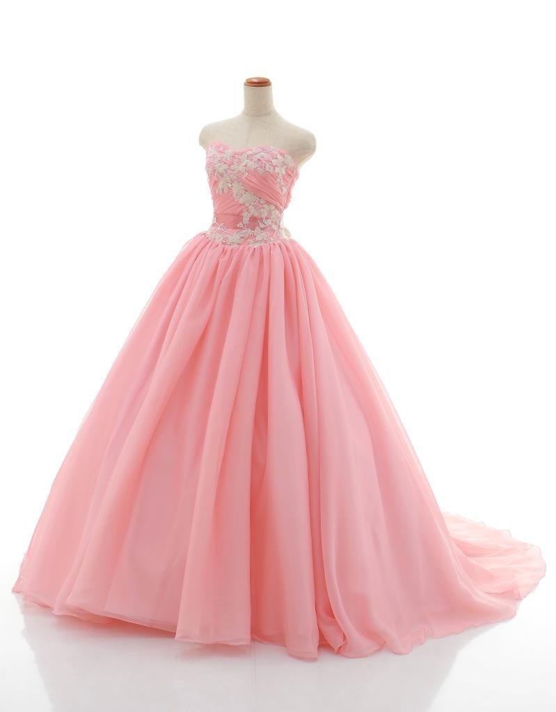 サーモンピンクのドレス。シンプルなオーガンジーのスカートに、胸元はお花やビジューで装飾され華やか。花嫁の声を元に、着心地や動きやすさも考えられたドレスです。