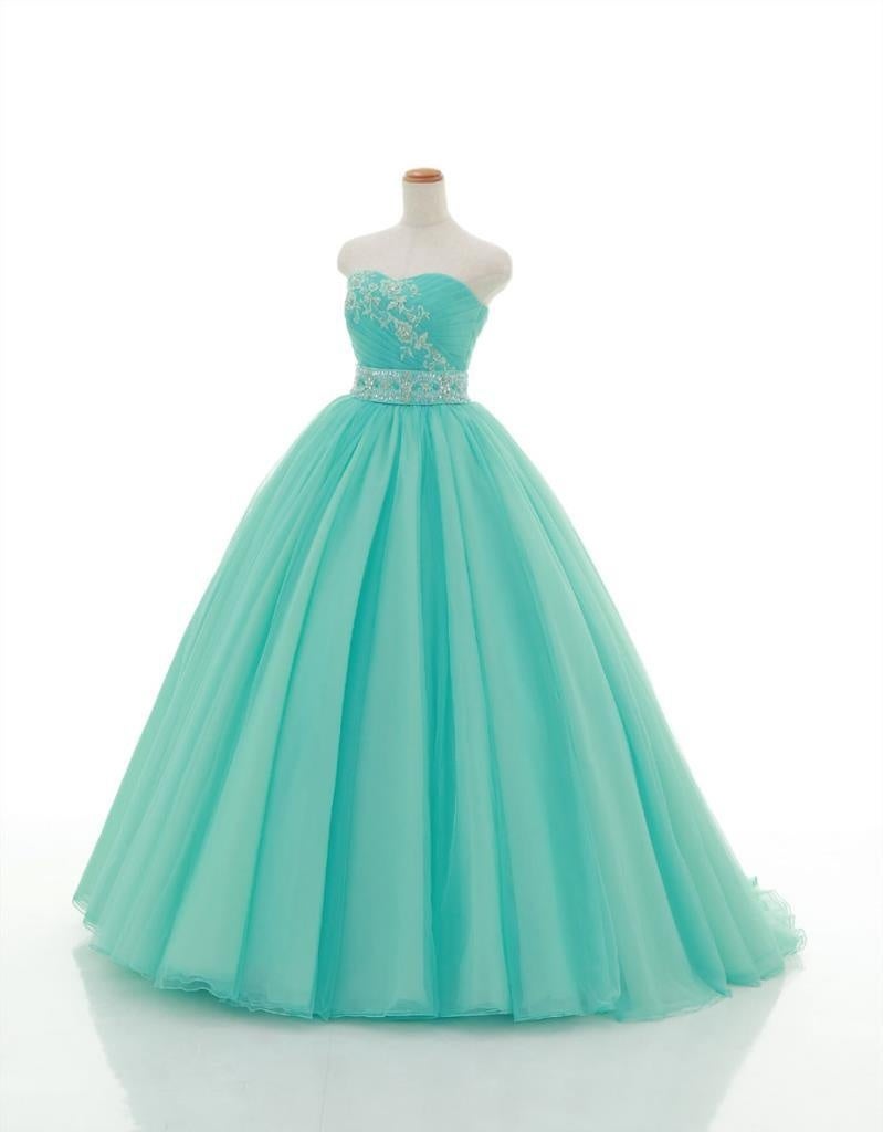 ブルーグリーンのプリンセスラインドレス。ボリュームたっぷりのチュールのスカートが花嫁にも人気。