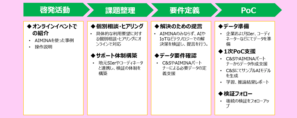 今回の協業は、大分県内の企業におけるAI利活用をさらに促進させることを目的としています。AIセンターが中心となり、AIの普及・啓発イベントや研修などを通して、利用者への個別ヒアリングやサンプルのAIモデルの生成などをSB C&Sと共にサポートします。また、SB C&Sは、「AIMINA」の6カ月間のフリートライアルアカウントを提供します。