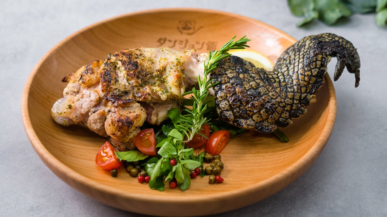 レッドドラゴンをイメージしたワニ⾁のステーキ。香り豊かなハーブとスパイスを効かせています。