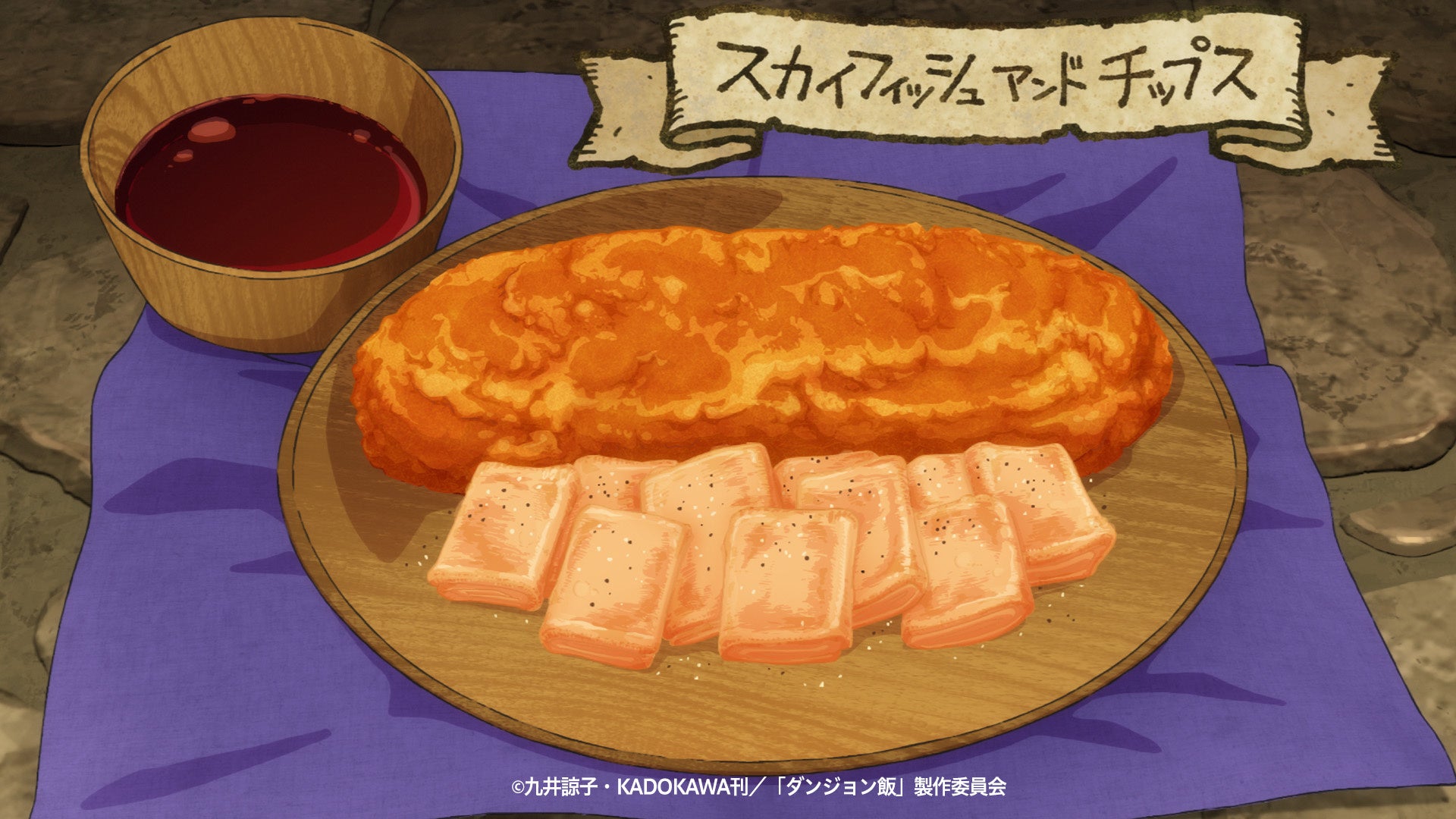 魔物「グリフィン」に連れ去られてしまったセンシをみつけるため、マルシルが召喚した使い魔、「スカイフィッシュ」が食材となった料理。無事にセンシを助け出し役目を果たした使い魔を、ライオスが無神経にも料理……。