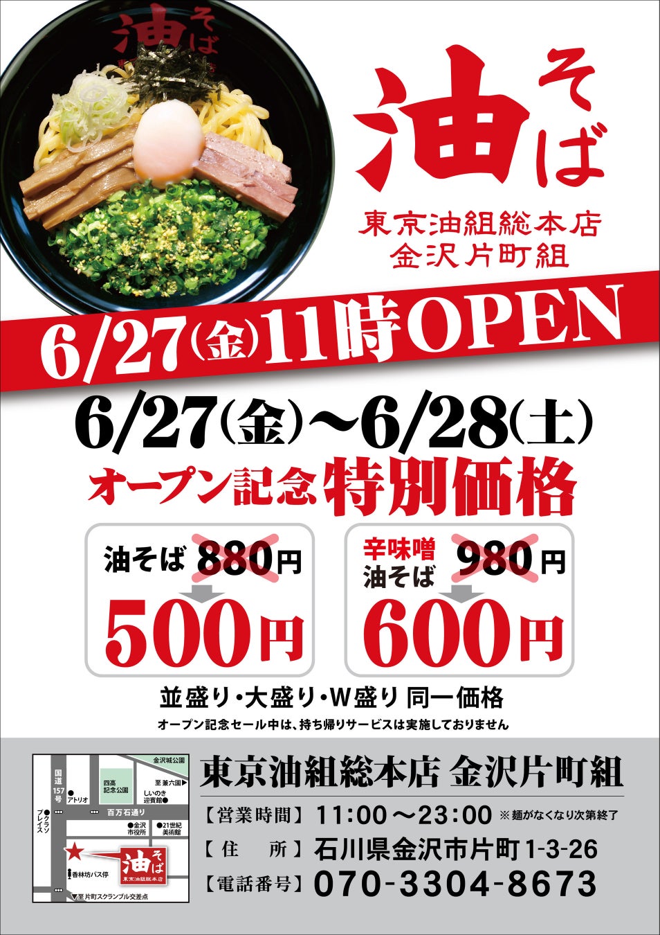 石川県初出店を記念し、2025年6月27日(金)・ 28日(土)の2日間、「油そば」 と 「辛味噌油そば」 を特別価格でご提供いたします!(東京油組総本店 金沢片町組のみで実施)