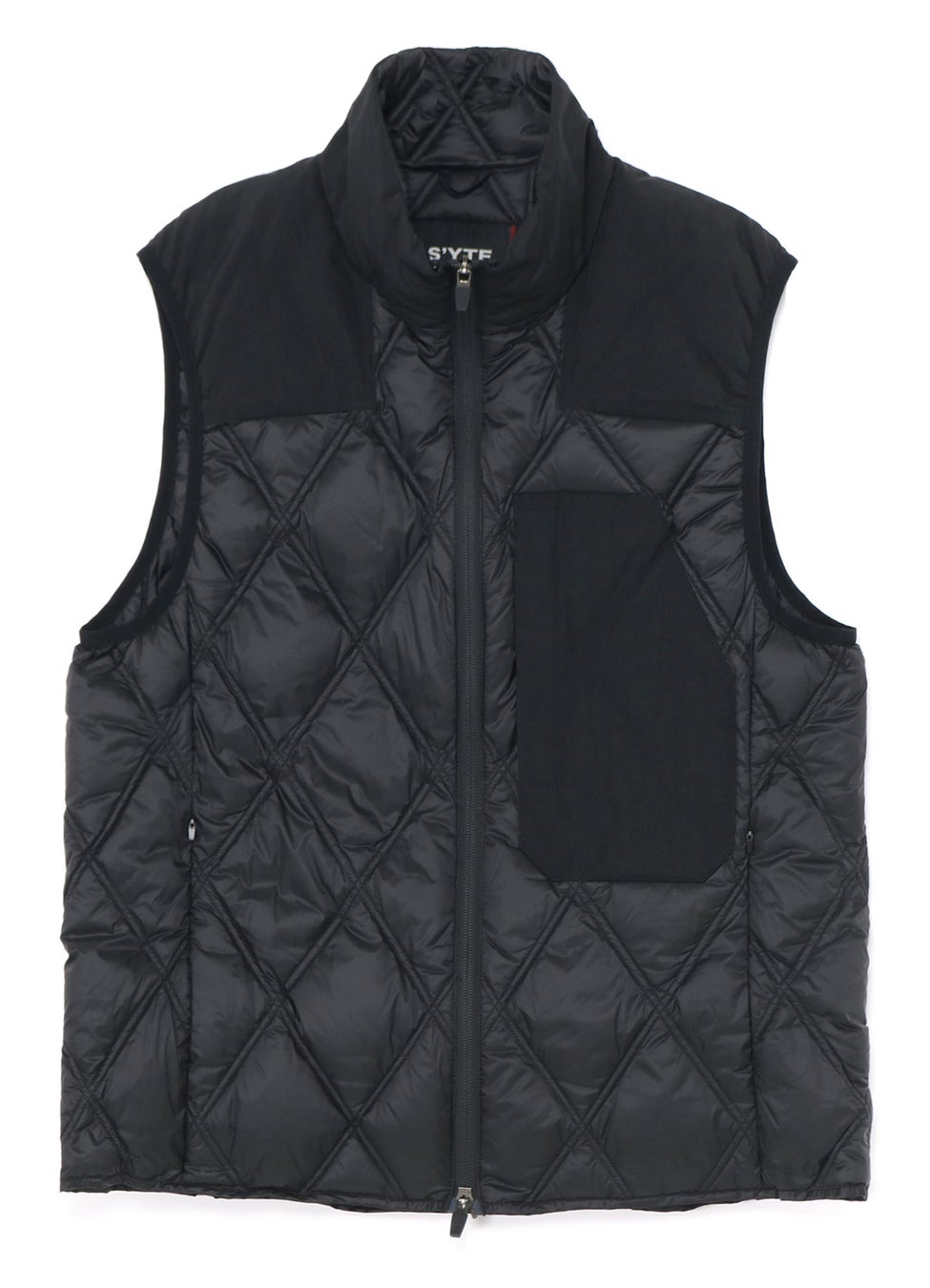 TAIONのベーシックインナーダウンのパターンをベースに襟、肩、フロント胸ポケットに別生地の切り替えを入れS’YTEオリジナルデザインへアップデートしました。ハイネックタイプで、ジャケットやコートの下や、Tシャツ、シャツ、スウェットなど様々な洋服の上からでも羽織ることができ、軽くて暖かい高機能アイテムとなっています。また、コンパクトに収納可能なロゴ入りの収納袋も付属。