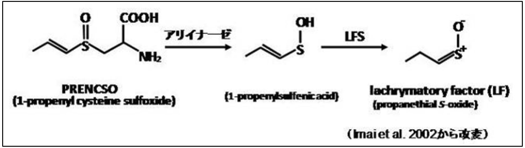 催涙成分合成酵素(lachrymatory factor synthase:LFS、催涙成分(=辛み成分)を作り出す化学反応を起こす酵素)を発見。涙が出る原因となる「催涙成分」は、アリイナーゼ(催涙成分ができるのに必要な酵素の一つ)と LFS が反応することで生み出されることを発表(学術雑誌「Nature」に掲載)。 催涙成分が生成される仕組み(反応経路)を応用して「涙の出ないタマネギ」ができるのではないかと考え、研究は次のステップへ。 遺伝子組み換えではない手法(重イオンビームをタマネギの種に照射し、育てたタマネギの中から、催涙性の弱いものを探し育てる)によるタマネギの品種改良をスタート。 |