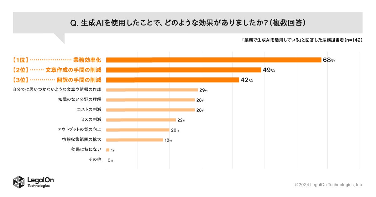 「業務で生成AIを使用している」と回答した法務担当者に、使用の効果を伺ったところ68%が「業務効率化」と回答しました。「文章作成の手間」(49%)、「翻訳の手間の削減」(42%)と続きました。