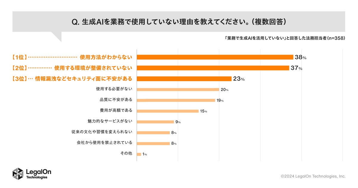 現在業務で生成AIを使用していない方に理由を伺ったところ「使用方法がわからない」(38%)、「使用する環境が整備されていない」(37%)が上位に並びました。