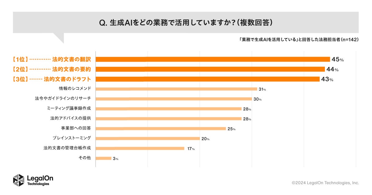 法務担当者の29%が「現在、業務で生成AIを活用している」と回答。活用場面は法的文書の「翻訳」、「要約」、「ドラフト」。