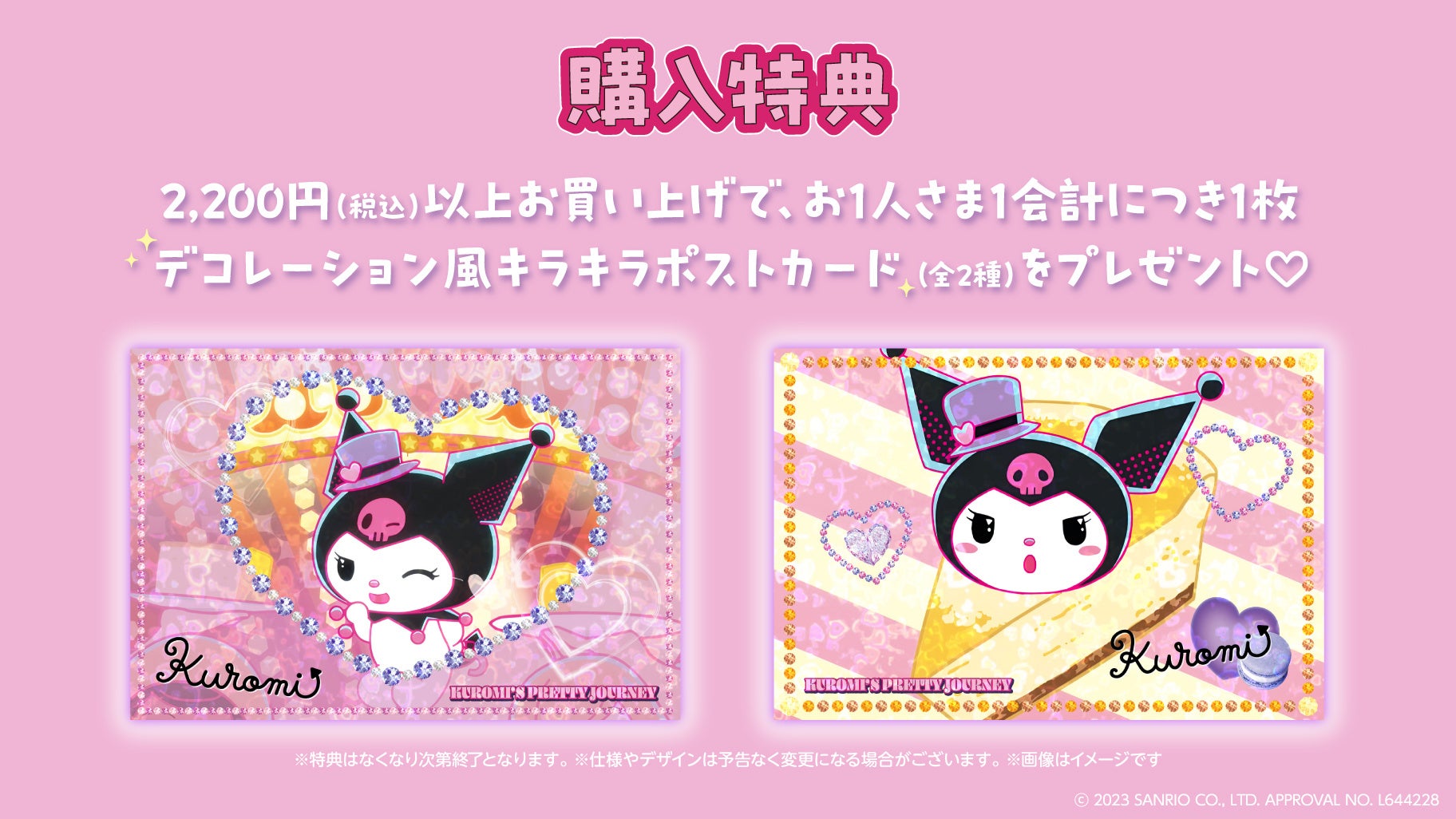 YouTubeとTikTokでの総再生回数2000万回突破のクロミが主役のショートアニメ「KUROMI’S PRETTY JOURNEY」をモチーフにしたポップアップストアを、2023年10月27日(金)より渋谷にて実施いたします。本イベントだけのオリジナルグッズのほか、ショートアニメの世界観を落とし込んだ内装やフォトスポット、購入特典プレゼントなどをご用意しています。