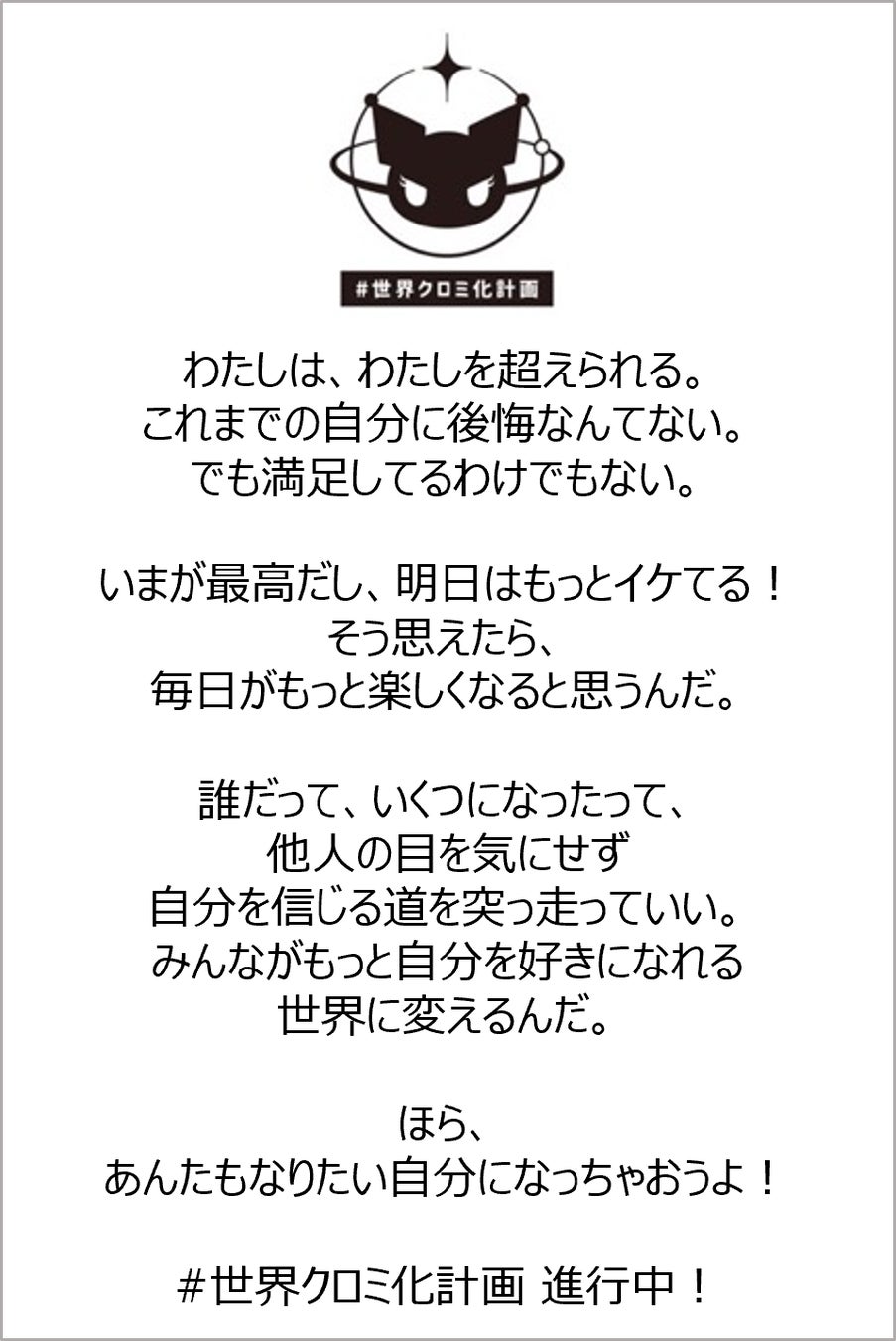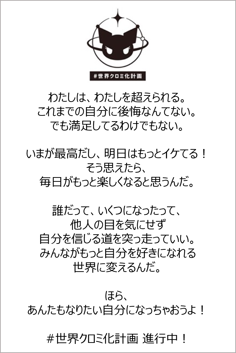 「#世界クロミ化計画」とは、世界をクロミとKUROMIESでいっぱいにする計画です。クロミのメッセージを伝えていくことで、クロミに共感しクロミと共になりたい自分になっちゃう仲間「KUROMIES」を増やしていきます。今後のクロミの活動にご期待ください。