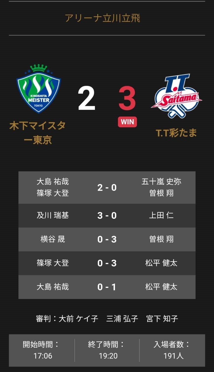 木下マイスター東京とT.T彩たまの試合は3-2でT.T彩たまが勝利しました。
