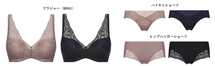 デザインは、グローバルシリーズならではのスタイリッシュさ。リサイクルナイロン糸を使用した繊細かつモード感の漂うストレッチレースを贅沢に使用しました。カラーもシックな秋冬色にアップデート。アウターライクなグレーは、トレンドの注目色。ブラックはネイビーを透かせた、スタイリッシュ&エレガントなムードです。