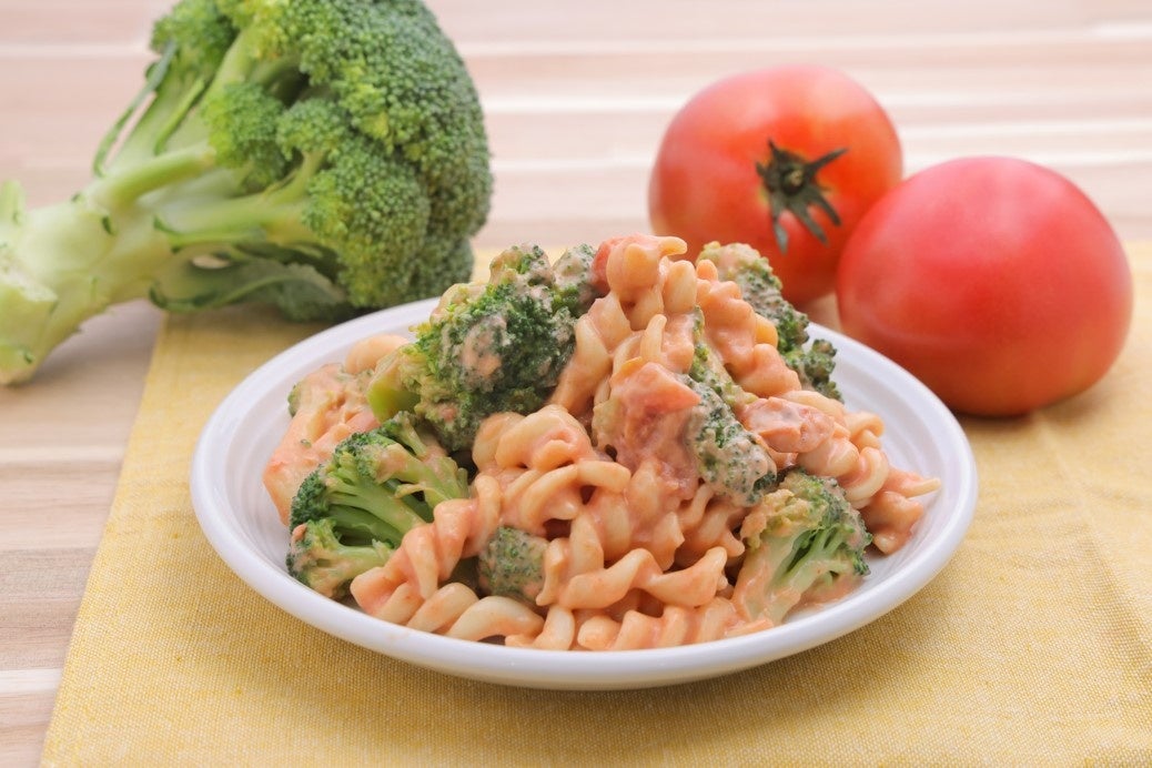 トマトの酸味とクリームのコクがバランスよい魚介風味のトマトクリームソースに、らせん状のフジッリとブロッコリーを和えました。